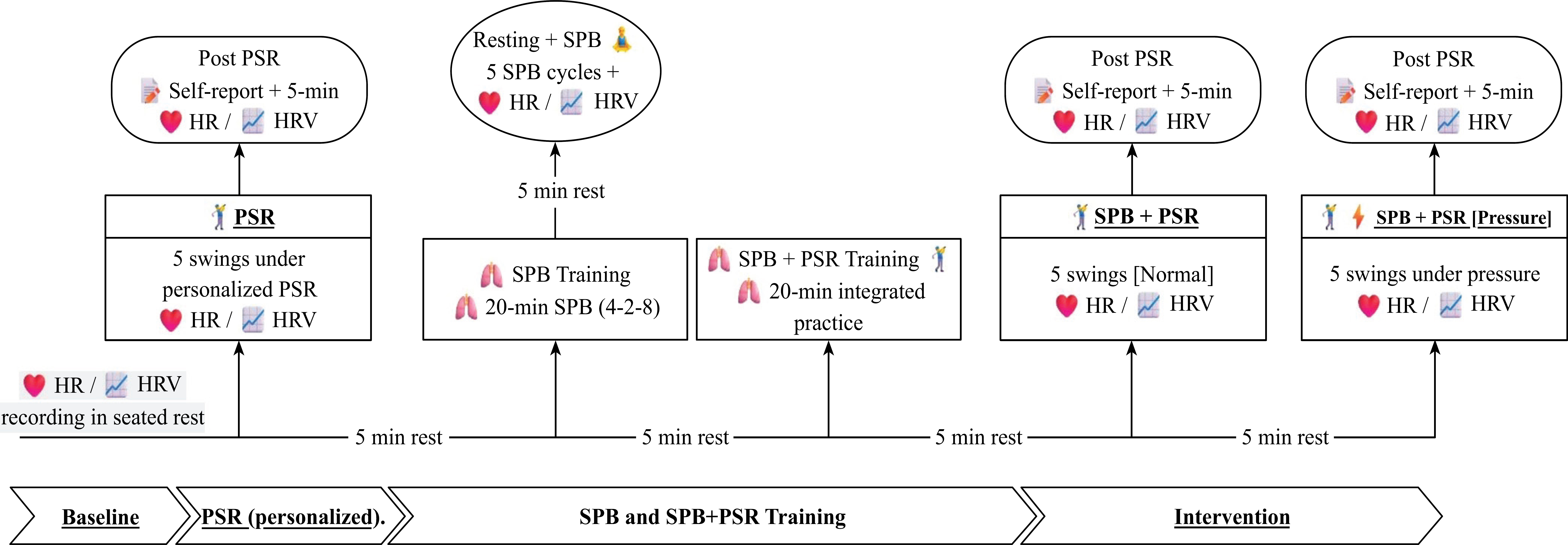 The experiments took place in a distraction-free, climate-controlled laboratory maintained at 23–25°C. After attaching ECG electrodes to monitor physiological changes, participants completed an initial 5-minute seated rest to establish baseline heart rate (HR) and HRV. Afterward, they followed a standardized warm-up consisting of 5 minutes of light movement and 10 minutes of progressive swings, concluding with a final 5-minute seated rest. As shown in Figure 1, HR and HRV data were collected during two resting periods (Baseline and Resting+SPB), three golf swing conditions (PSR, SPB+PSR [Normal], and SPB+PSR [Pressure]), and three post-task phases. Each post-task phase began with a psychological readiness self-report, followed by HR and HRV monitoring.