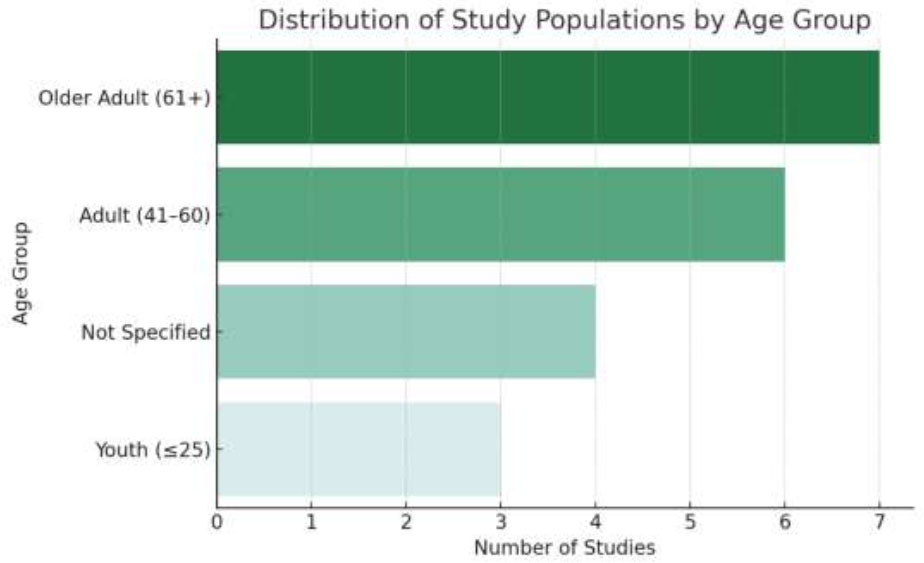 - Youth (≤25 years) represent a substantial portion of the studies, highlighting interest in developmental vulnerability, emotional coping, and preventive interventions among juvenile and young offenders.