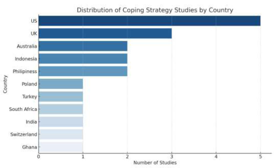 The chart illustrates the distribution of 20 empirical studies on inmate coping strategies across different countries. The United States leads with the highest number of studies (5 studies), reflecting its significant academic interest and investment in correctional psychology and prison rehabilitation research. The United Kingdom follows with 3 studies, and Australia with 2 studies, both of which have well-established criminal justice and psychological research infrastructures. Interestingly, countries from the ASEAN region, including Indonesia and the Philippines, are also represented. Indonesia contributes 2 studies, focusing specifically on female inmates and the role of family support, signaling the country's growing research attention toward gender and socio-cultural dimensions of incarceration. The Philippines is represented by 2 studies, which emphasize the reintegration experiences and coping mechanisms of former offenders in community settings. This inclusion of ASEAN countries like Indonesia highlights the broadening of the scope of prison-related psychological research beyond Western contexts, offering culturally grounded insights and the potential to inform localized intervention programs based on unique social and familial structures.